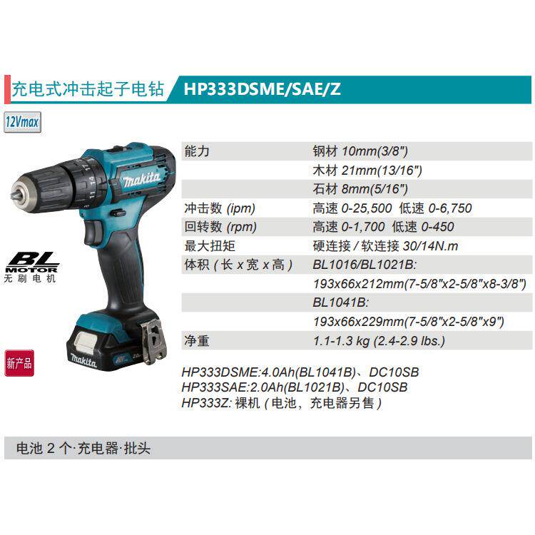 牧田充电式冲击起子电钻HP333DSAE/DSME/Z无刷电机冲击钻12V锂电