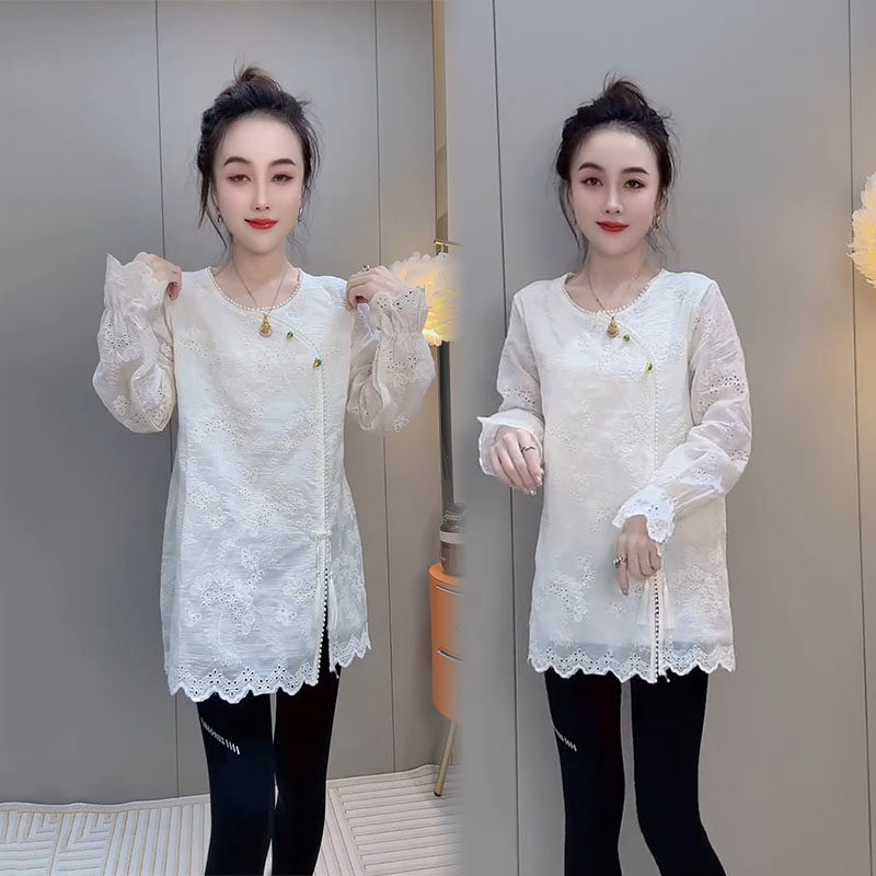 新中式重工钉珠中长款刺绣蕾丝衫2025冬季新款洋气喇叭袖百搭上衣