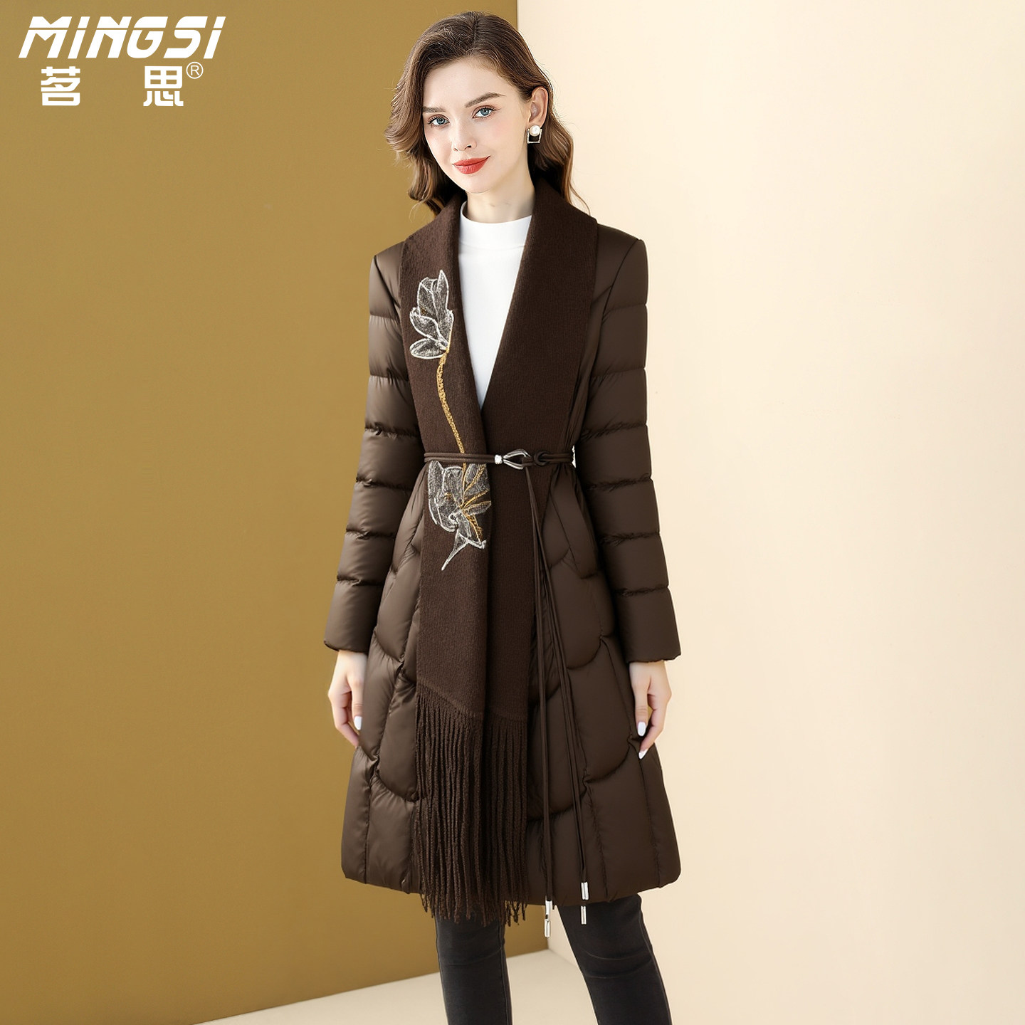 茗思拼接双面呢白鸭绒羽绒服女冬2025新款中长款刺绣流苏保暖外套