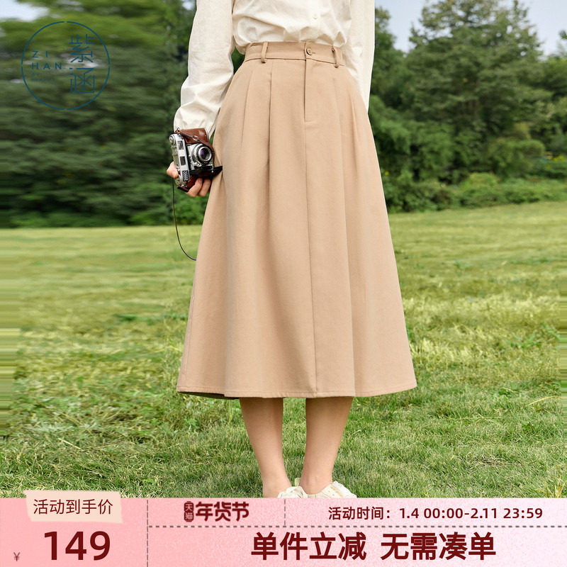 紫涵中长款刺绣伞裙女春秋季新款简约休闲高腰垂坠感a字半身裙子