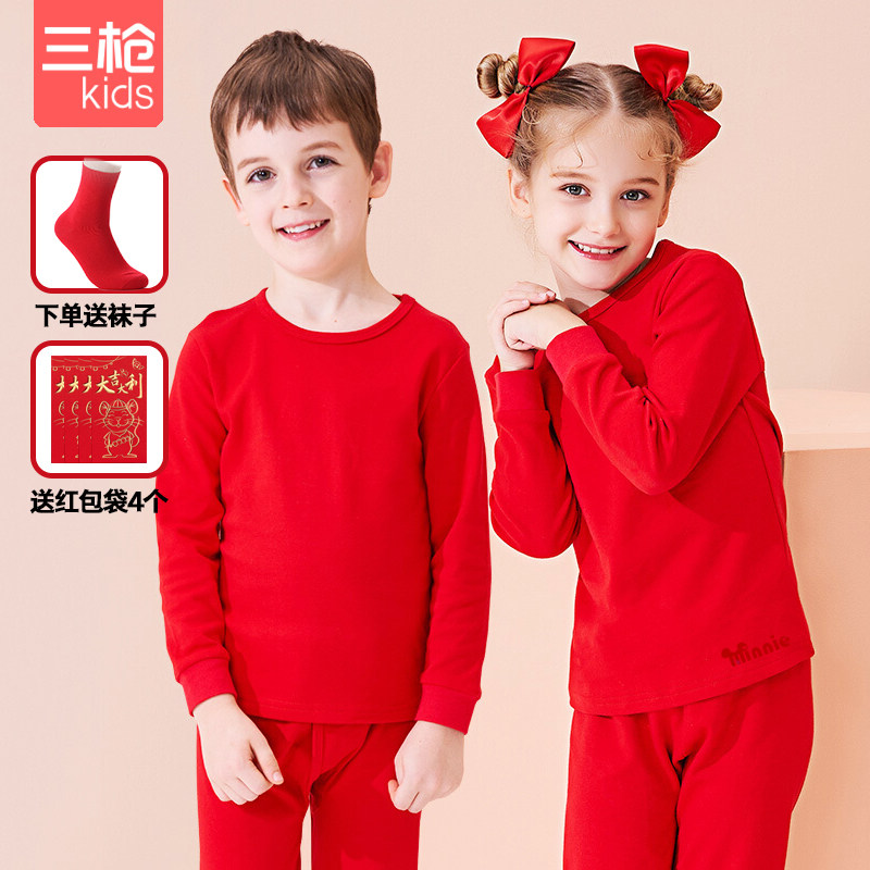 三枪全棉儿童圆领内衣套装大红色 男女童秋衣裤过年服本命年A类
