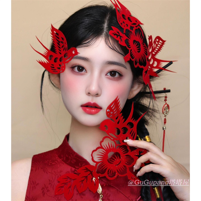 新中式国风红色喜鹊花朵剪纸发饰女复古喜庆结婚敬酒礼服头饰新年