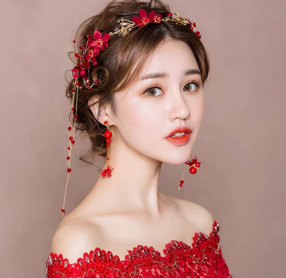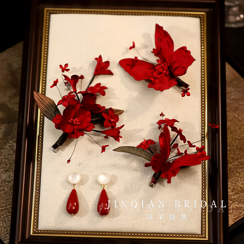 新中式拉丝花朵头饰新娘红色高级感结婚敬酒礼服旗袍个性百搭发饰