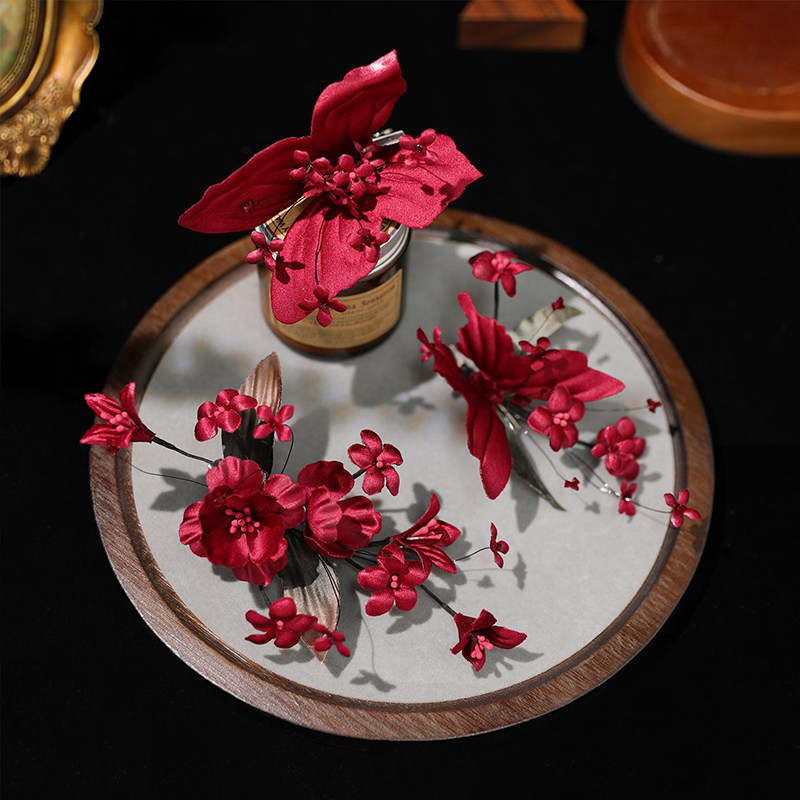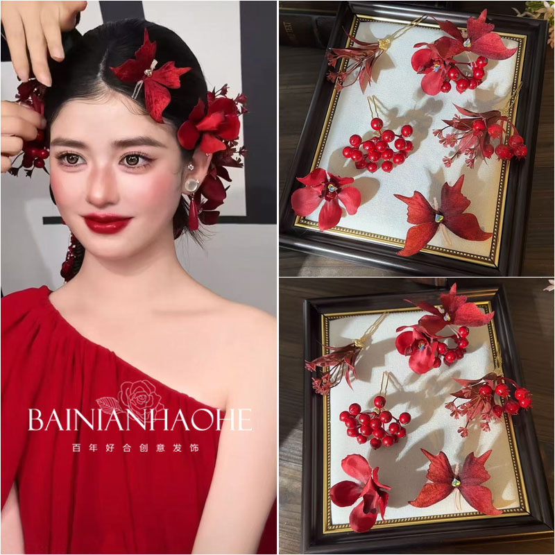 新款中式酒红色头饰花朵蝴蝶发夹新娘结婚敬酒礼服旗袍发饰配饰品