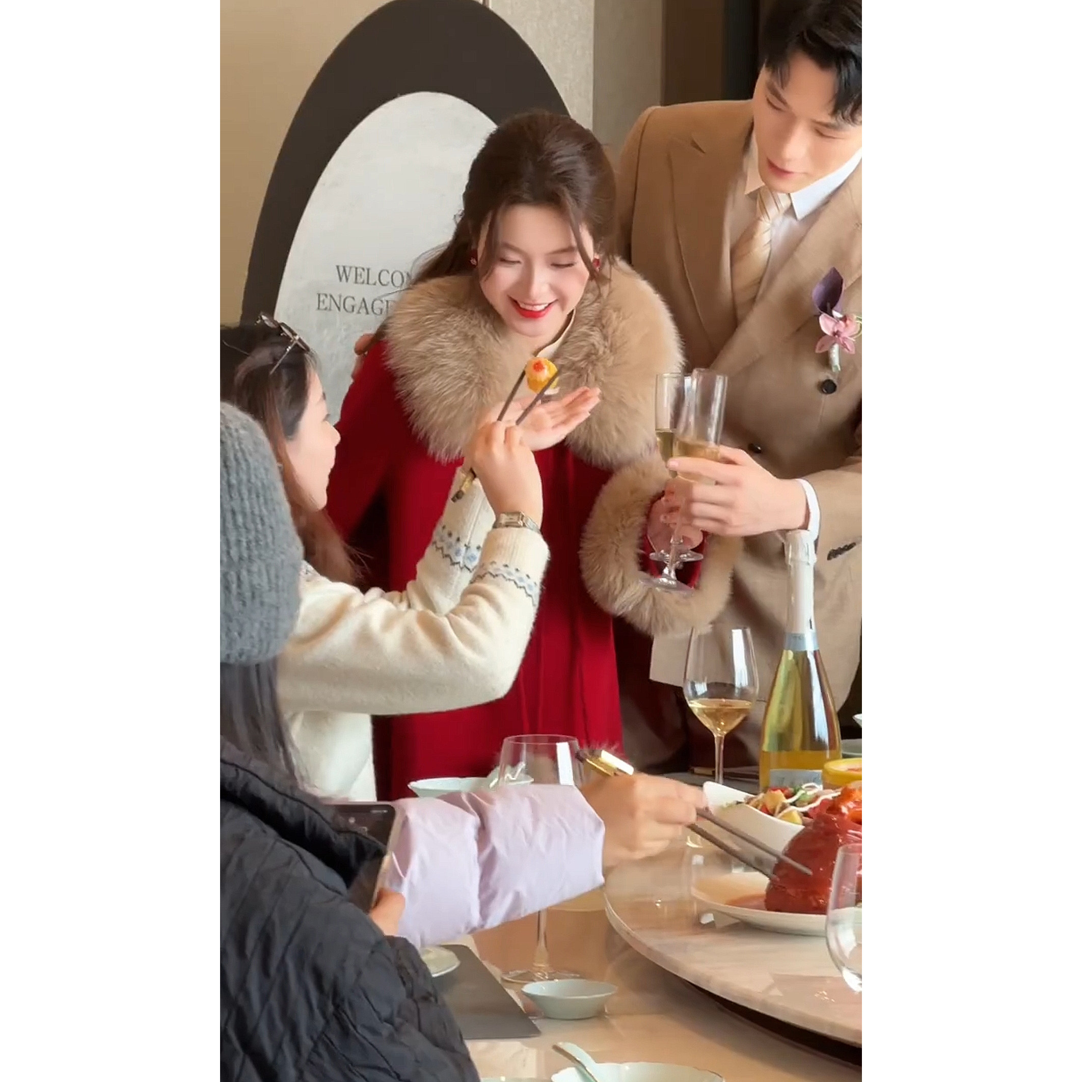 复古风高端毛领红大衣礼服女中长款宴会晚装外套结婚敬酒礼服保暖