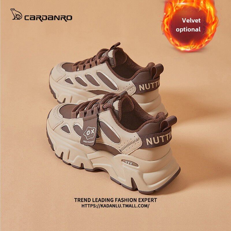 卡丹路厚底老爹鞋女2025新款秋季美拉德加绒女鞋休闲鞋真皮运动鞋