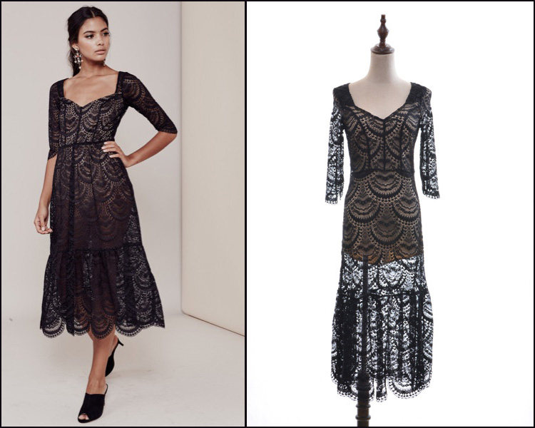 【特价】外贸原单欧美大牌 名媛气质黑色丝绒拼接蕾丝雕花连衣裙