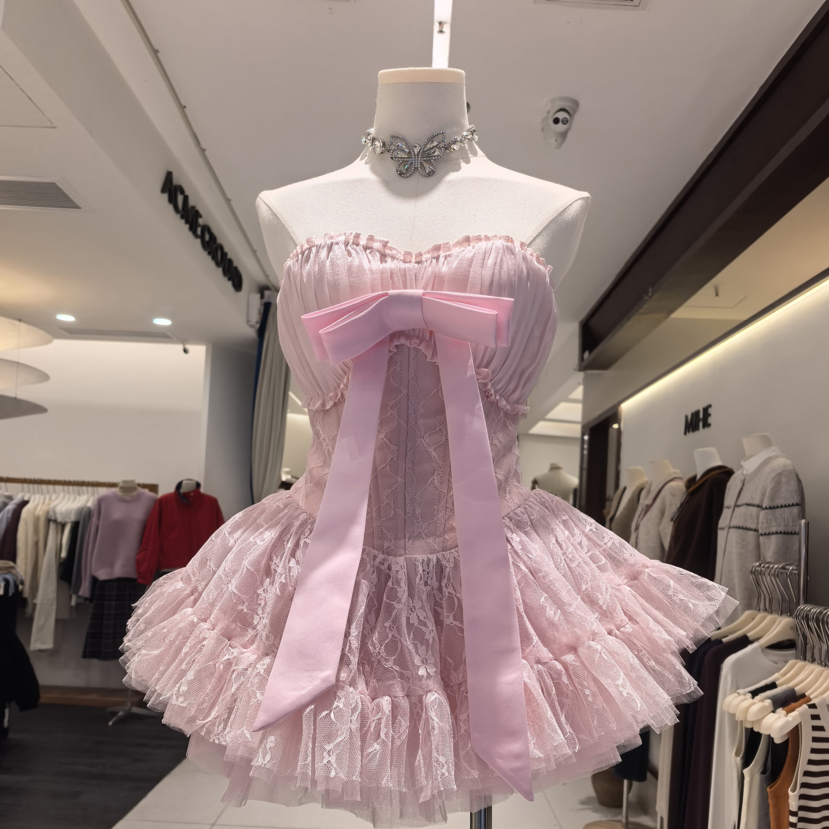 越南小众蕾丝抹胸鱼骨蝴蝶结蓬蓬礼服女高级感甜美性感辣妹连衣裙