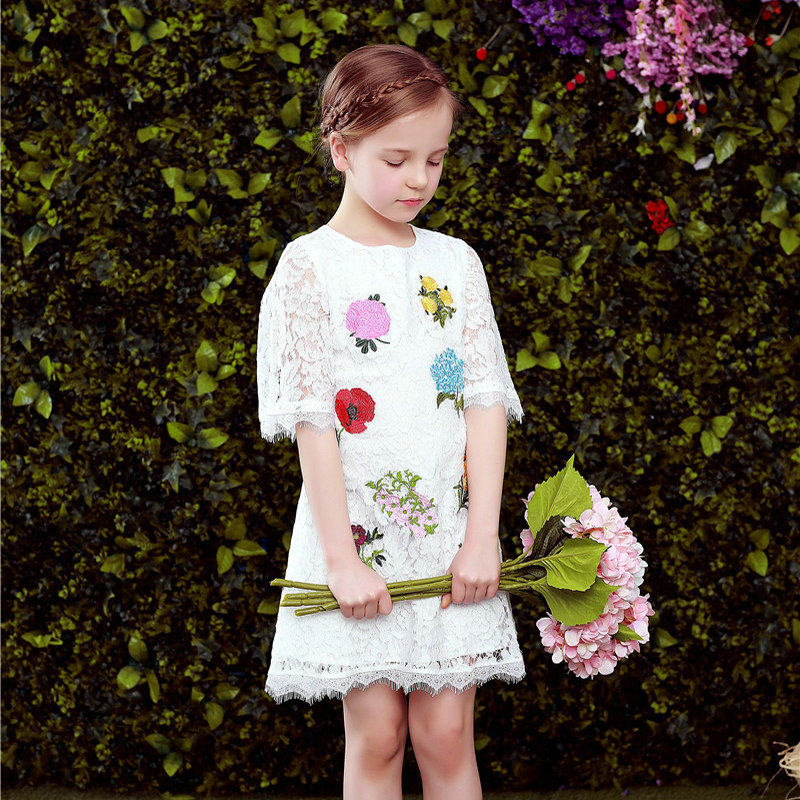 欧美大牌童装女童连衣裙夏装短袖蕾丝宝宝公主裙儿童裙子白色绣花