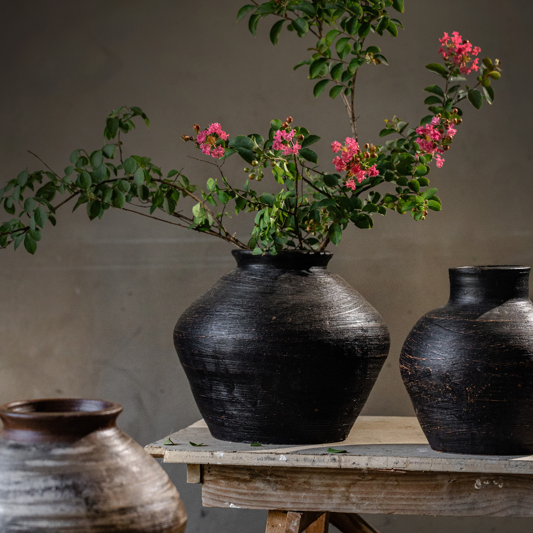 现代陶罐粗陶黑色罐子复古侘寂风花瓶摆件轻奢哑光中古花器装饰品