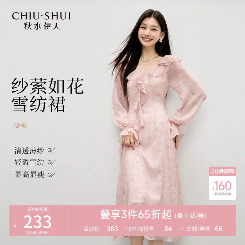 秋水伊人长袖碎花连衣裙2026春季新款女装温柔荷叶边清新雪纺长裙