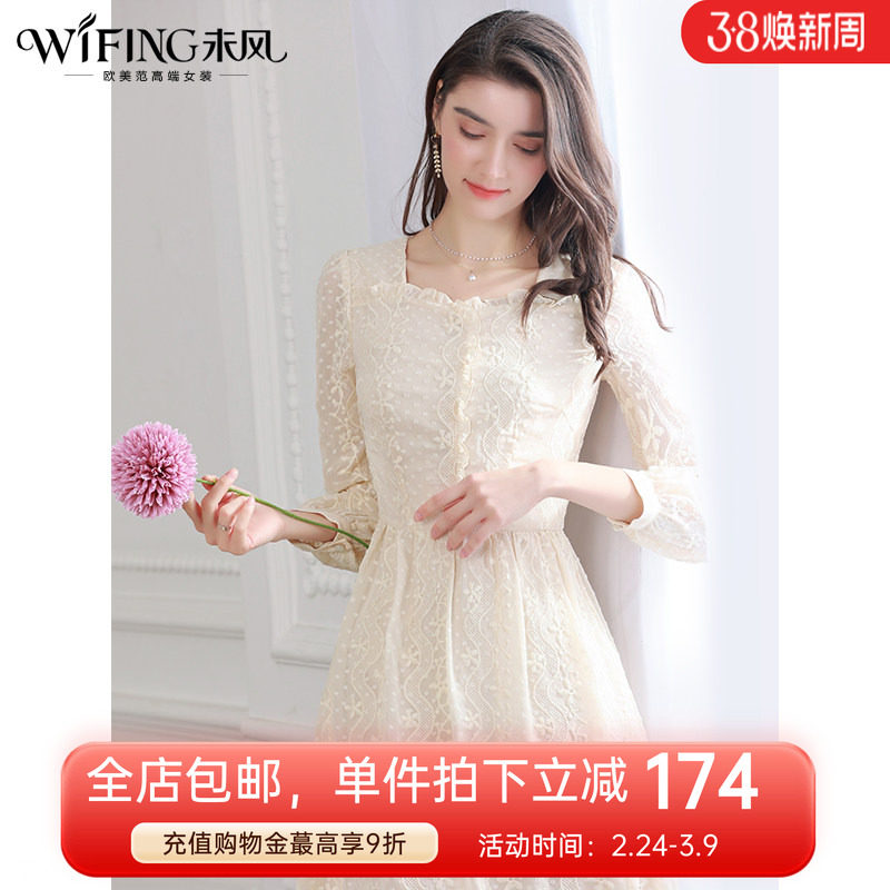 未风杏色雪纺绣花连衣裙女春2026年春季新款女装气质木耳方领裙子