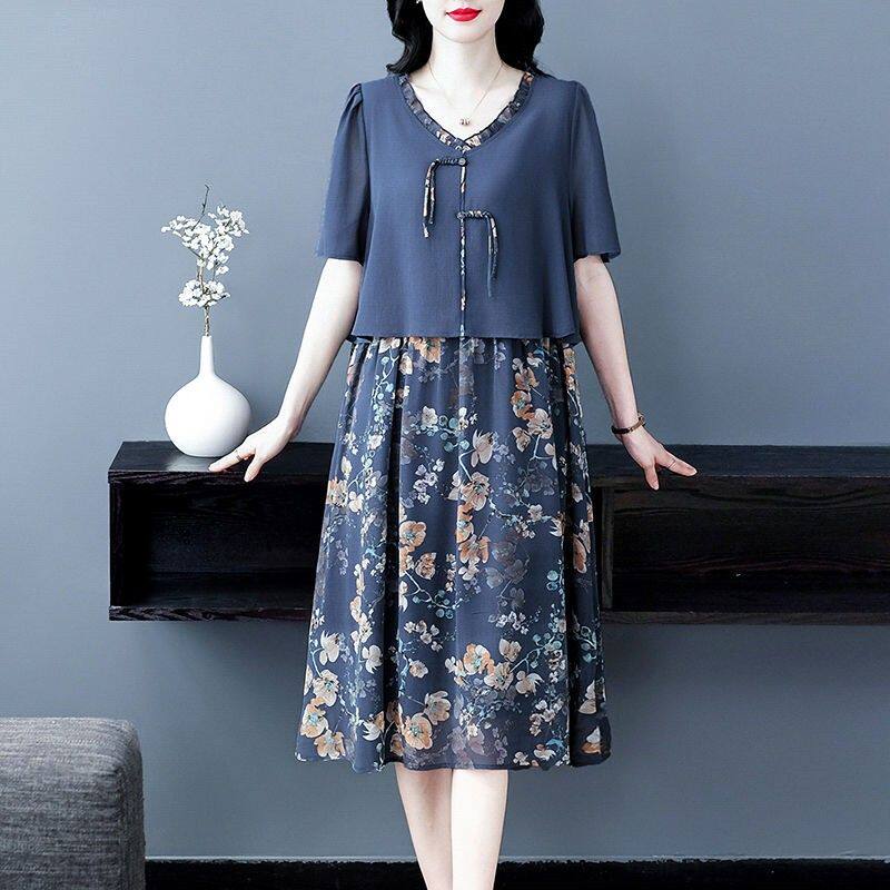 大码女装雪纺连衣裙夏季妈妈假两件拼接宽松遮肚子气质显瘦中长裙
