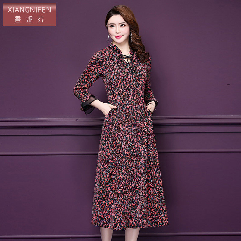 香妮芬2025早秋新款中年连衣裙女装雪纺大气中裙碎花大码妈妈裙