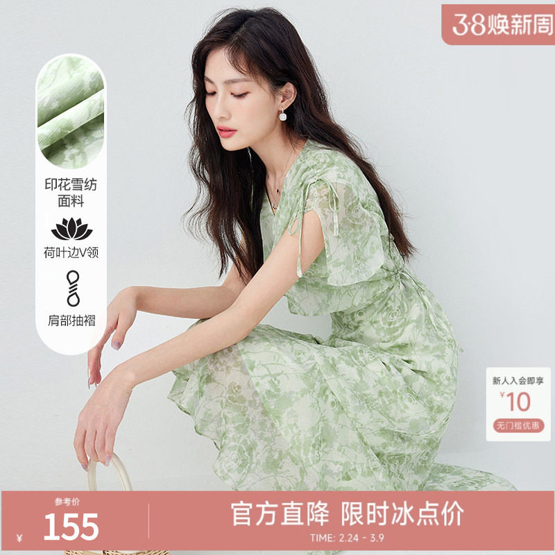 播雪纺连衣裙女商场同款2024夏新款中长款桔梗碎花裙BDR2LD1072