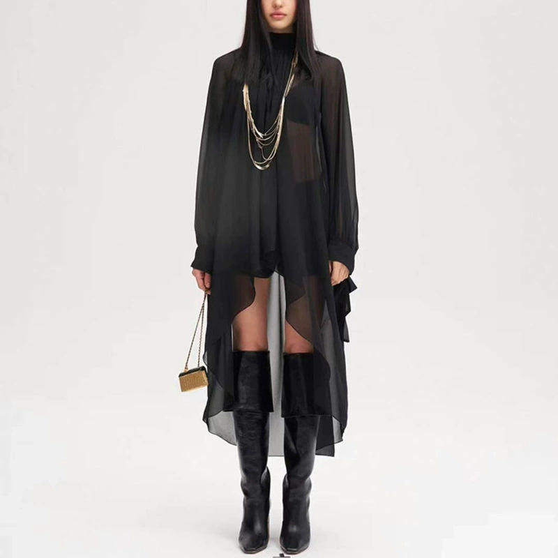 欧美女装雪纺连衣裙2026春季装立领绑带长袖荷叶边修身宽松长裙女