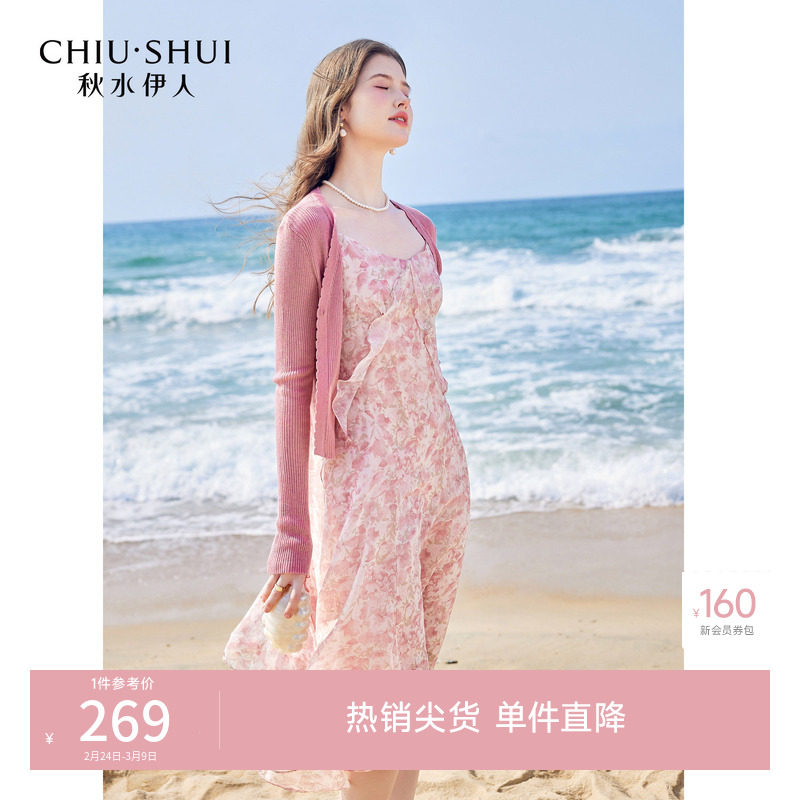 秋水伊人雪纺吊带连衣裙春秋新款两件套海边度假今年流行套装女装