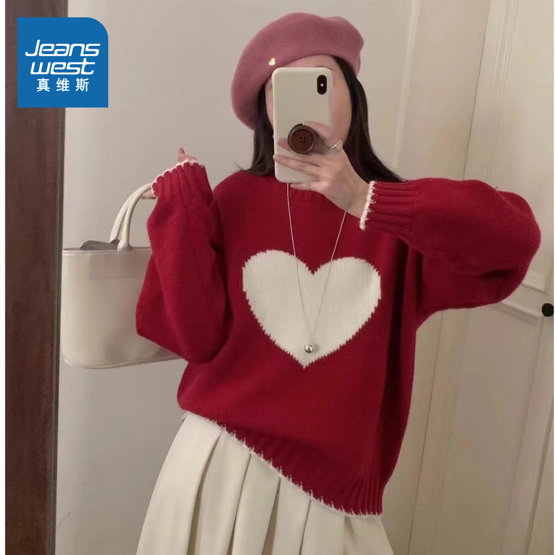 KY真维斯2025秋冬新款青少年女款爱心撞色套头毛衣针织衫外穿