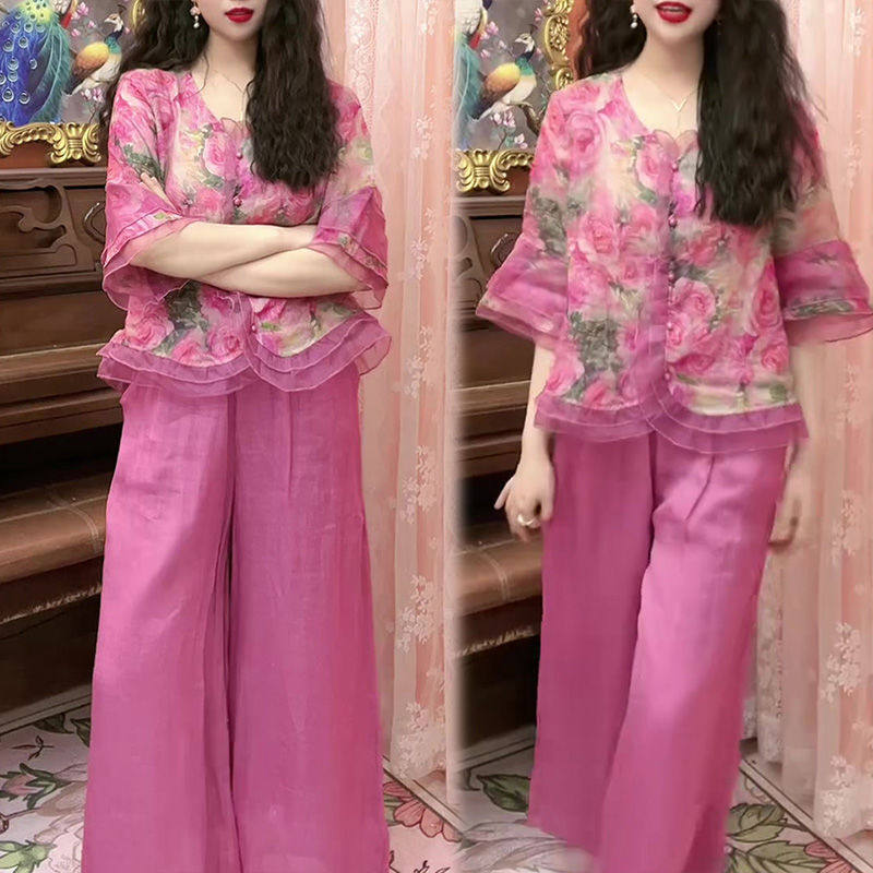 文艺民族风复古套装女2025夏季新款中国风印花衬衫简约阔腿裤套装