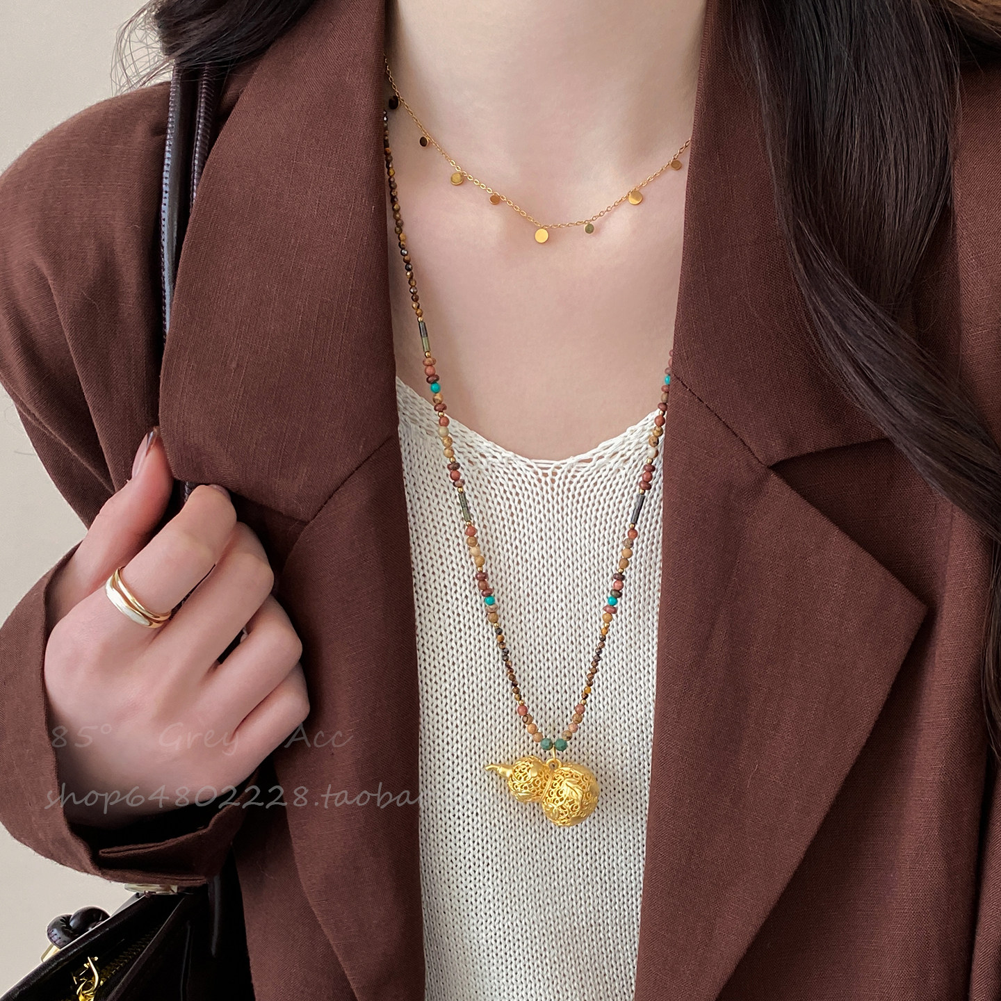 新中式天然石串珠项链女中国风镂空葫芦吊坠复古高级感毛衣链配饰
