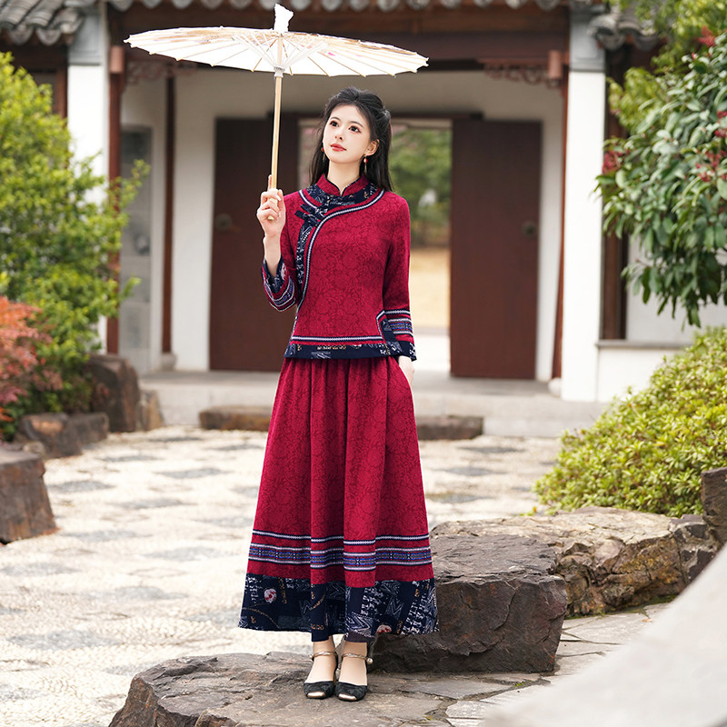 云南民族风套装女春秋复古上衣半身裙两件套中国风棉麻两件套装裙