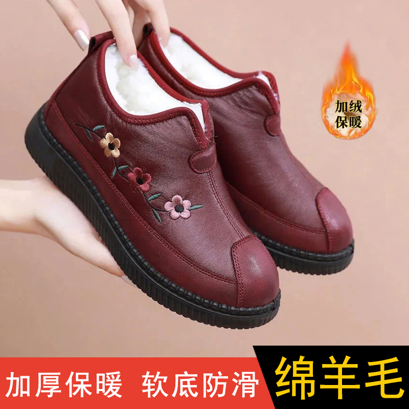 妈妈棉鞋女冬季防水保暖鞋中老年皮鞋软底防滑老人棉鞋加绒奶奶鞋