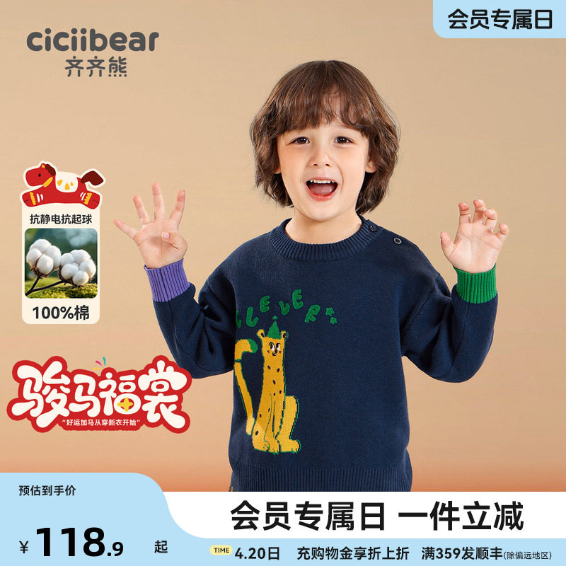 [100%棉]齐齐熊男童红色毛衣加厚拜年服宝宝秋冬针织衫儿童动物女