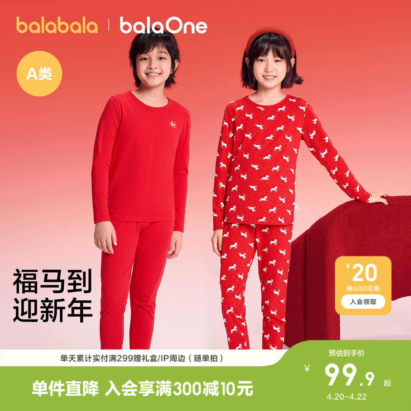 巴拉巴拉儿童内衣套装棉男童秋衣秋裤女童睡衣打底衫红色本命新年