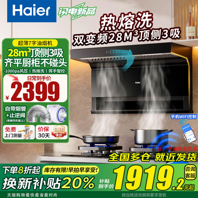 海尔变频顶侧3吸抽油烟机CXW-358-EC726U1热熔洗挥手手机WIFI智控