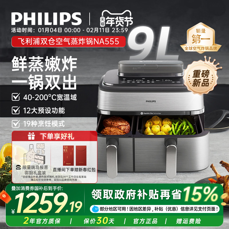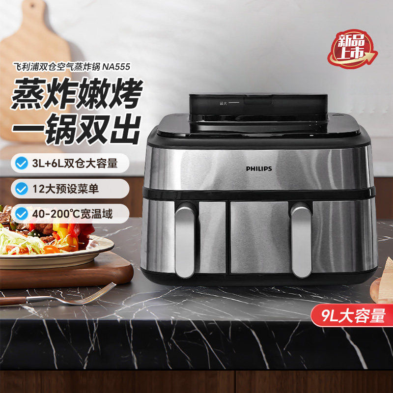 飞利浦空气炸锅NA555家用双仓蒸炸两用9L大容量电炸锅多功能一体