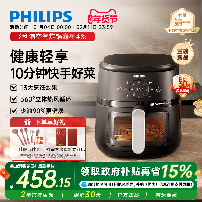 飞利浦空气炸锅4L家用新款大容量可视免翻面电炸锅多功能烤箱官方