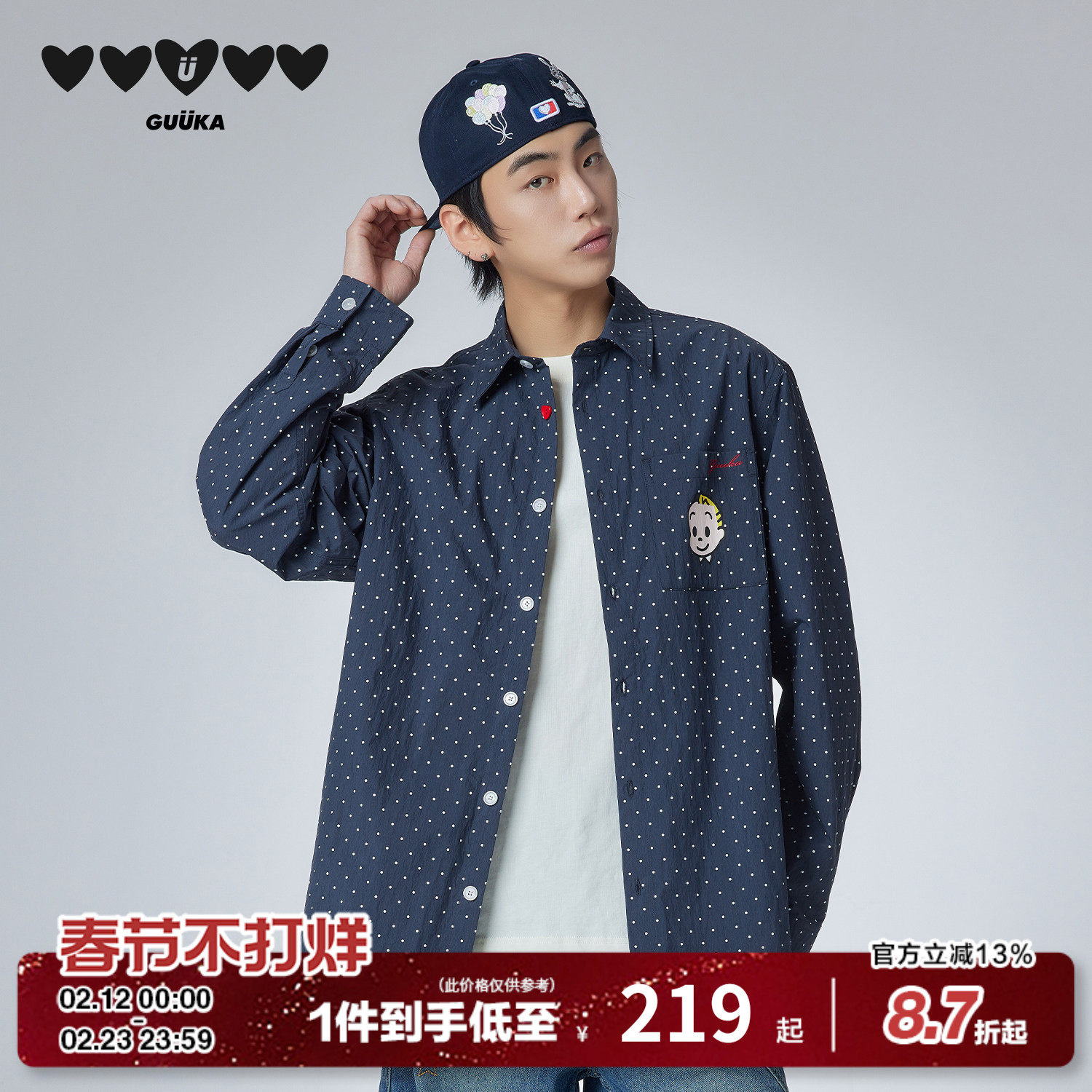 GUUKA&原田治联名杰克波点长袖衬衫男翻领衬衣情侣装爱心纽扣外套