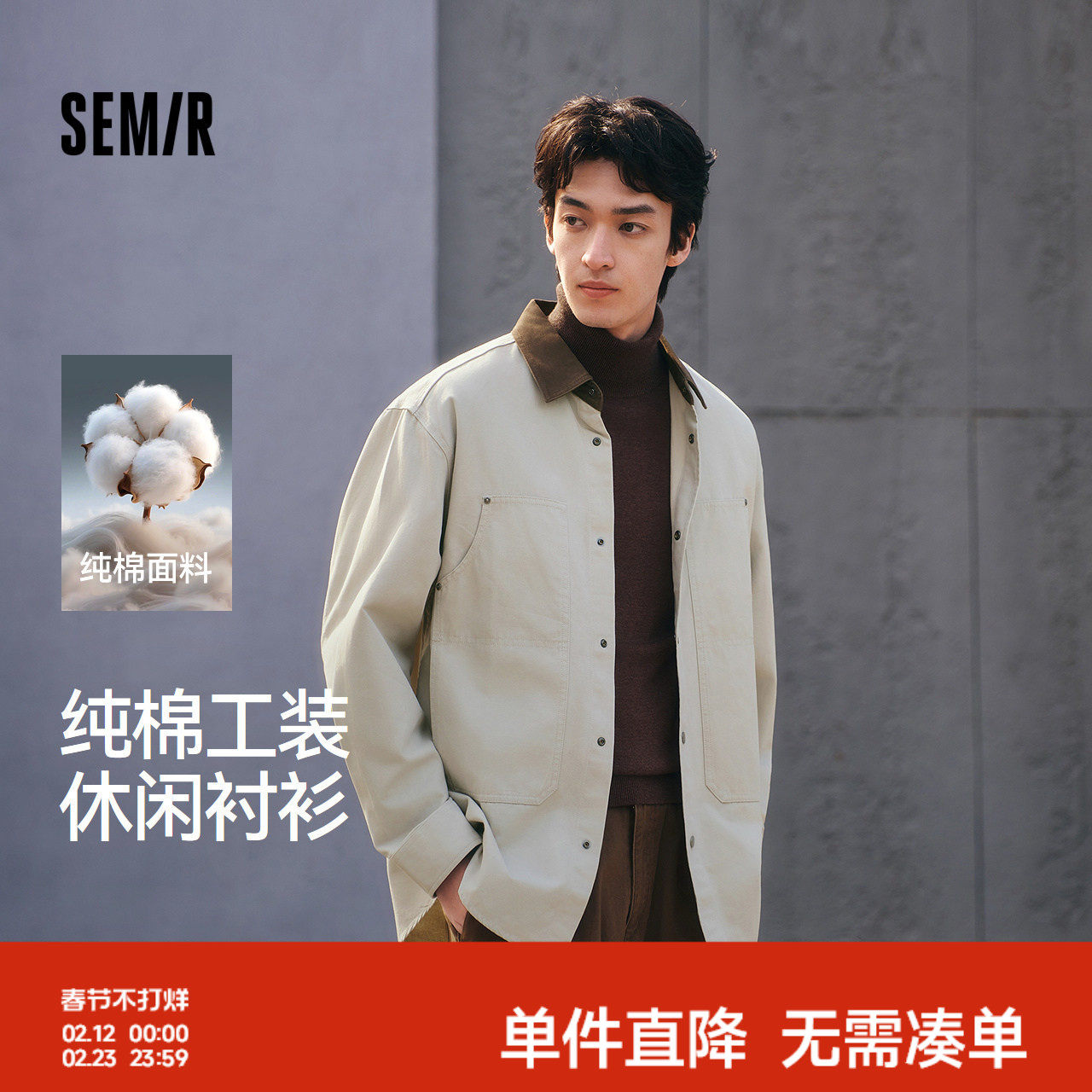 森马长袖衬衫男春季撞色宽松翻领上衣纯棉工装四合扣口袋水洗外套