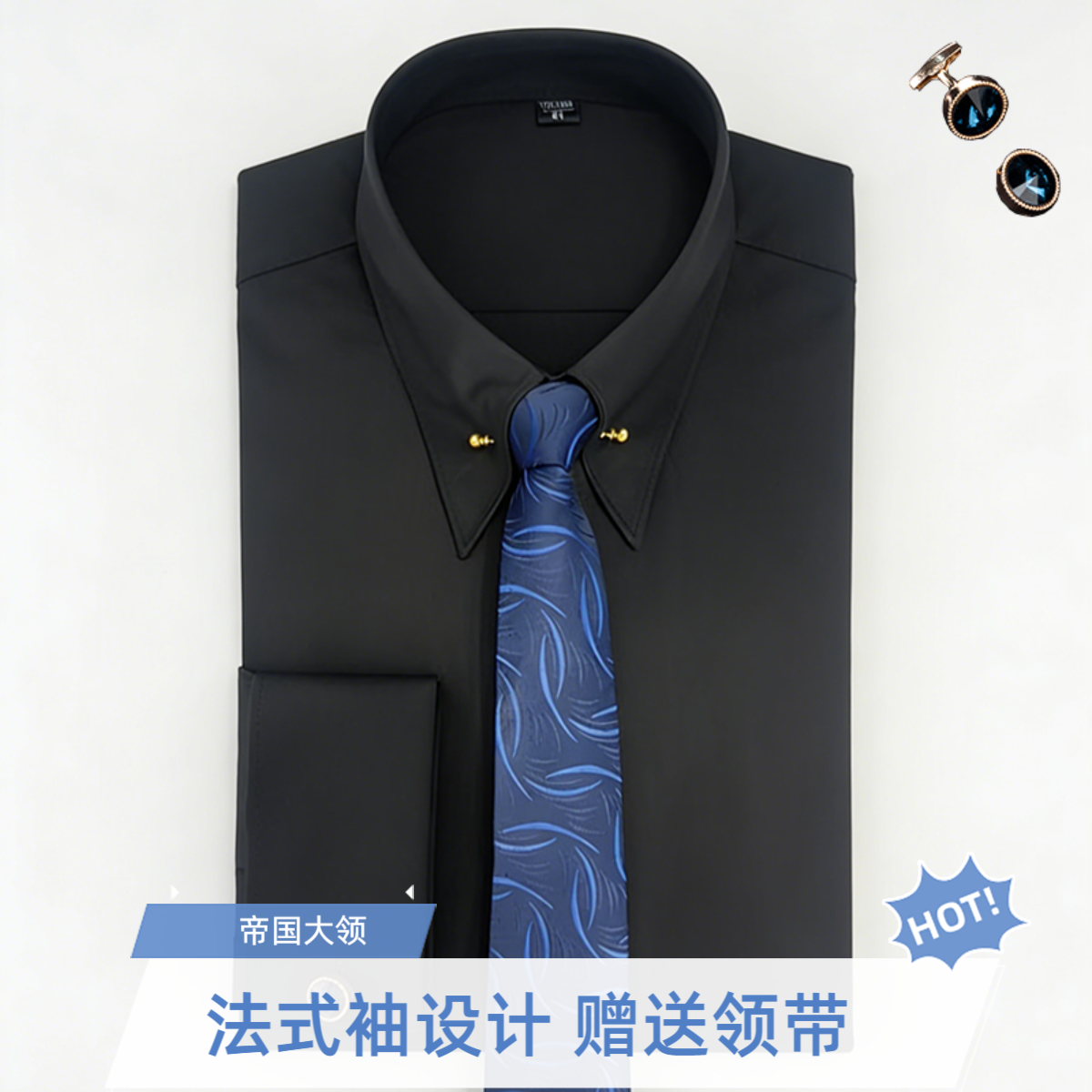 帝国领法式袖扣衬衫男装商务正装宴会结婚礼服大尖领送领针黑衬衣