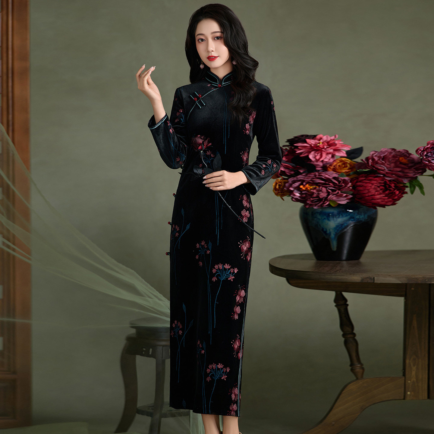 黑色金丝绒加厚加绒旗袍秋冬季2025新款漂亮独特长款长袖大码礼服