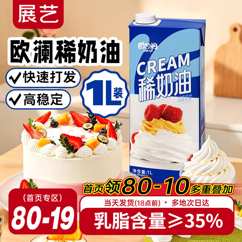 展艺欧澜稀奶油动物奶油1l淡奶油蛋糕挞裱花冰淇淋商家用烘焙专用