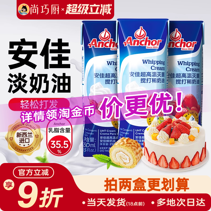 尚巧厨-安佳淡奶油250ml动物奶油原装进口裱花蛋糕专用家用烘焙