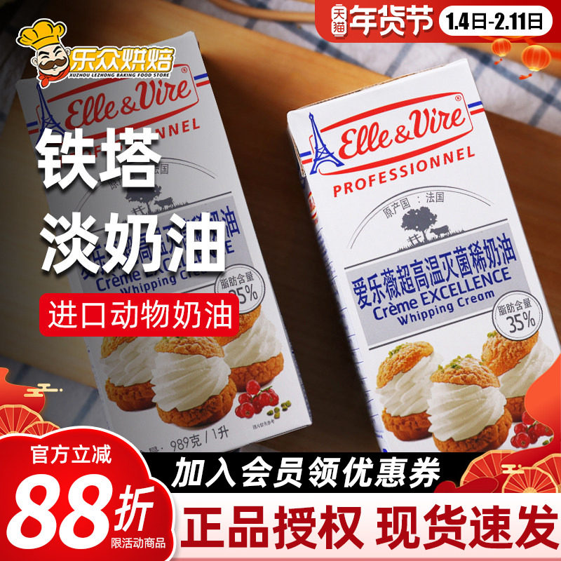 铁塔淡奶油家用烘焙爱乐薇稀鲜奶油1L蛋糕雪媚娘烘焙进口动物奶油