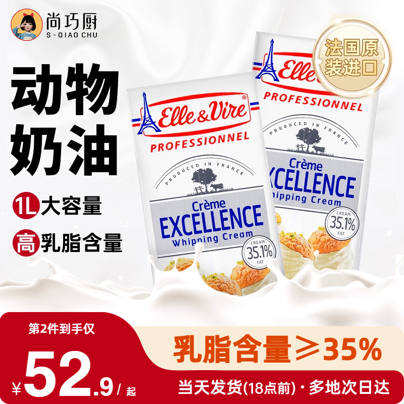 尚巧厨爱乐薇淡奶油1L法国铁塔动物奶油家用雪媚娘蛋糕专用烘焙