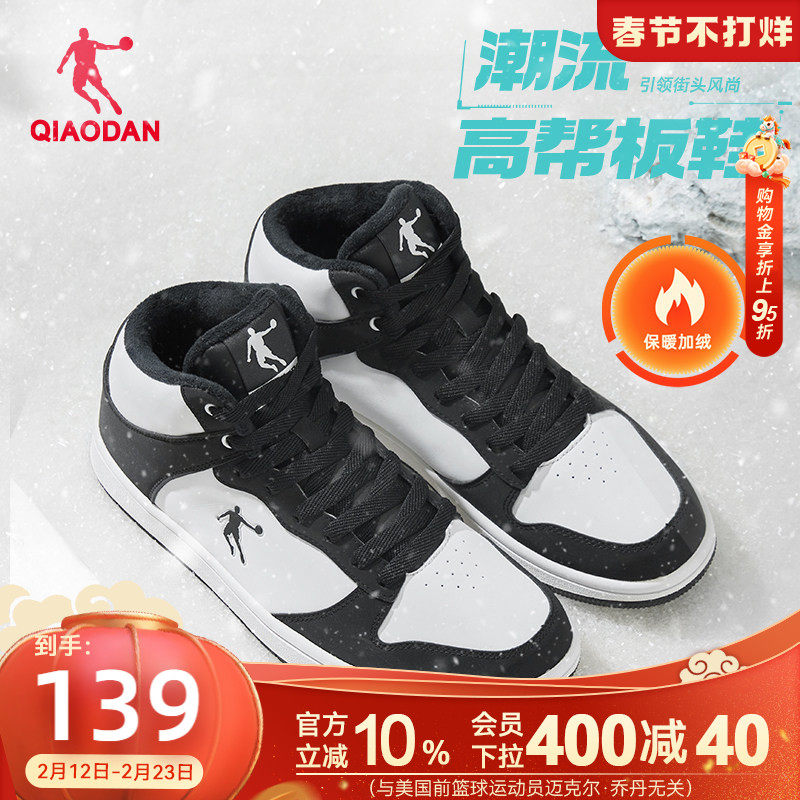 乔丹黑白薄底学生高帮加绒板鞋冬季新款棉鞋运动鞋革面保暖休闲男