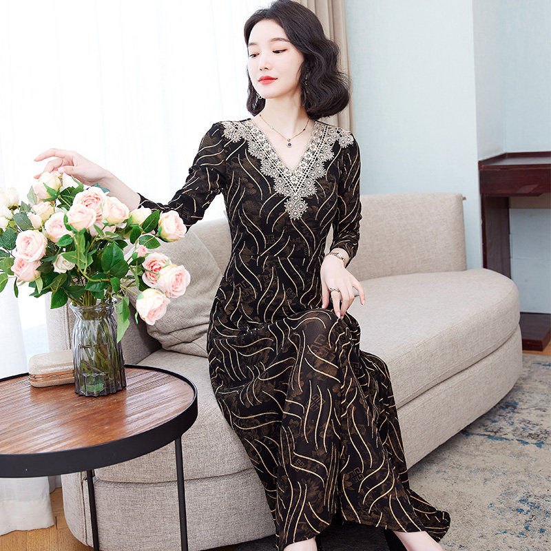 2024年秋装新款蕾丝拼接v领收腰显瘦胖MM大码连衣裙长款雪纺A字裙