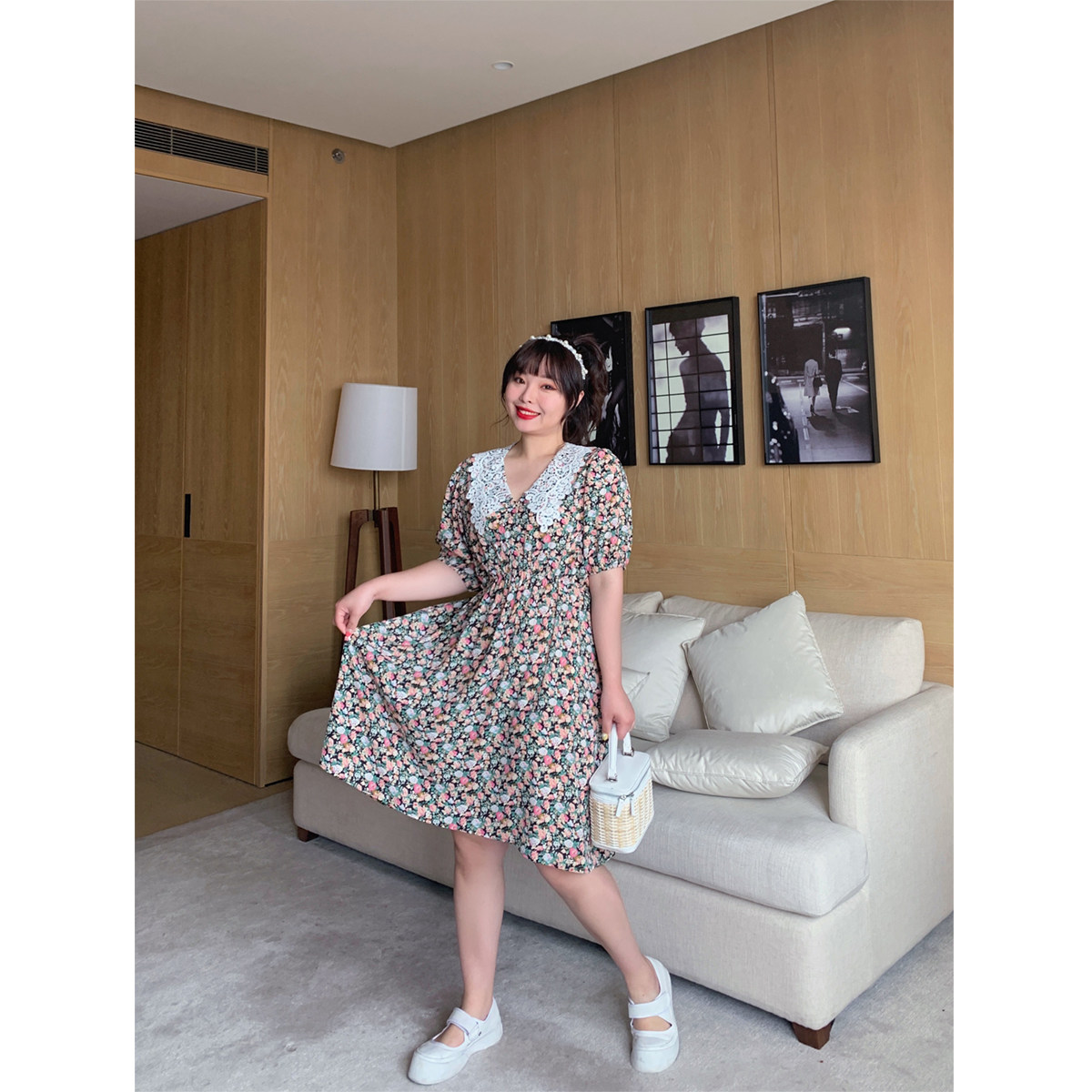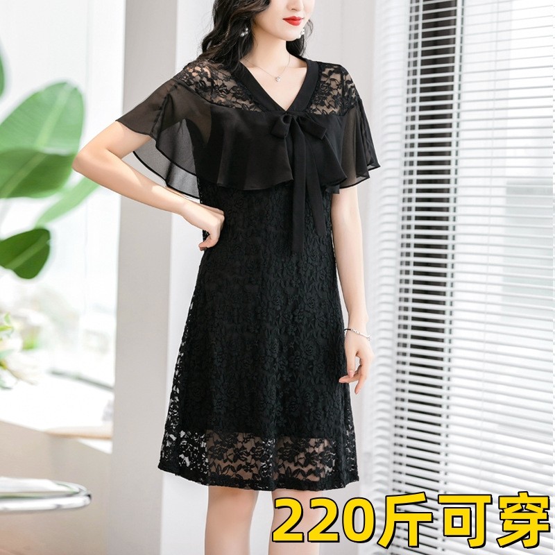 小个子雪纺连衣裙夏季大码气质蕾丝裙子胖妹妹200斤宽松遮肚女裙
