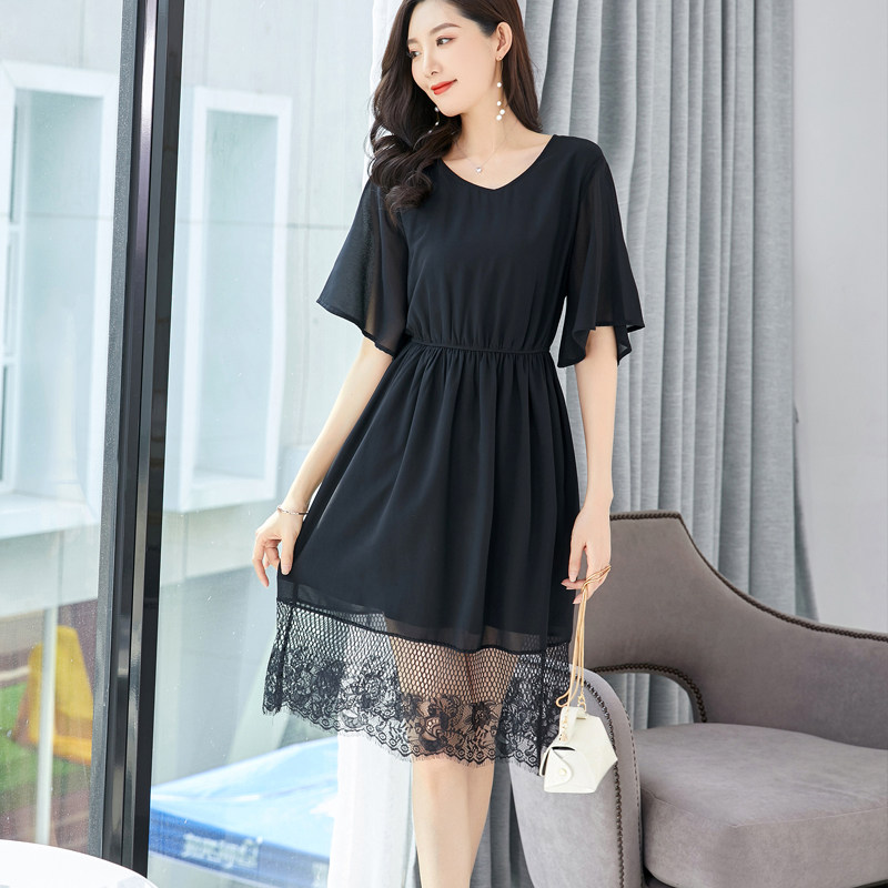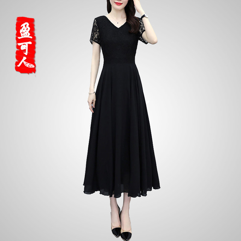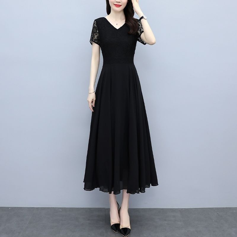 黑色碎花雪纺连衣裙2025春夏新款蕾丝v领收腰短袖大码中长款a字裙