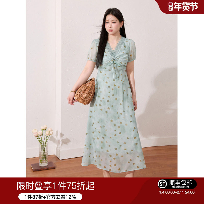蓝语大码女装法式蕾丝V领雪纺印花连衣裙夏新款显瘦度假风仙女裙