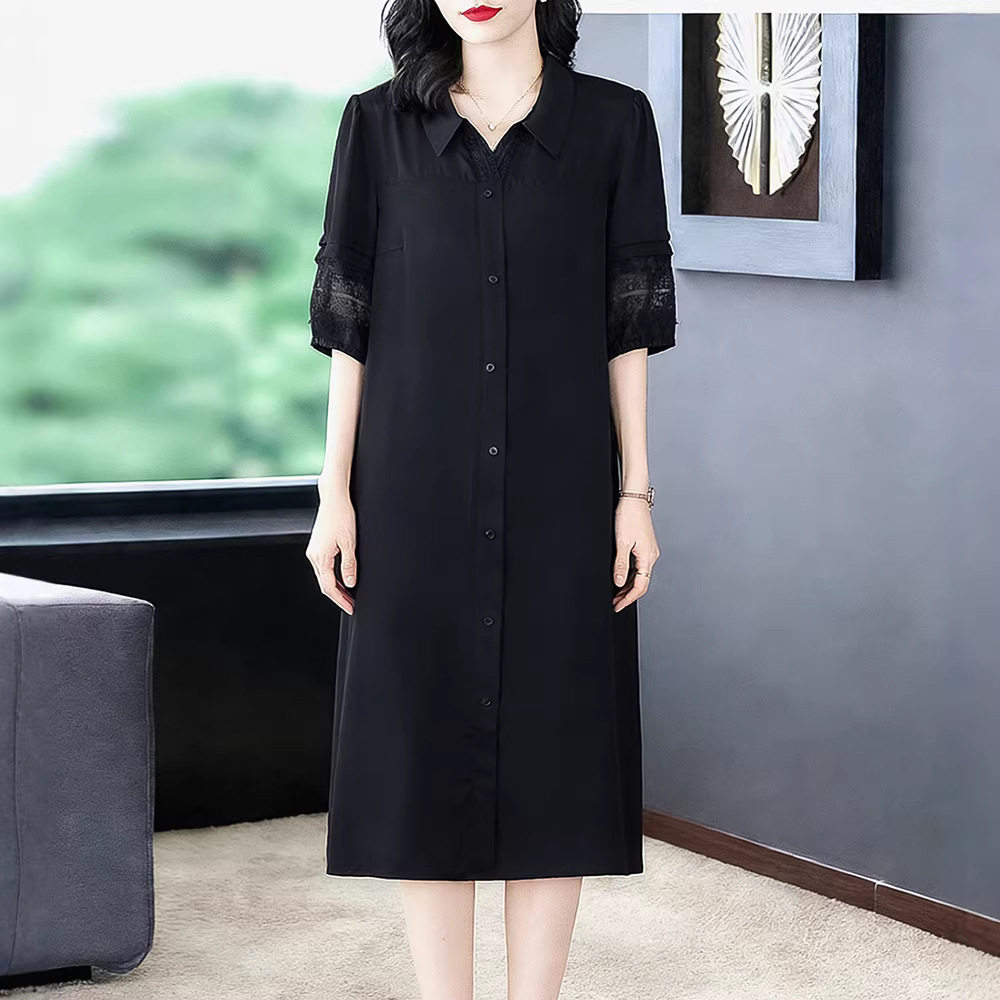 春夏季新款雪纺气质翻领开衫中长款蕾丝衬衫连衣裙子大码胖妈妈女