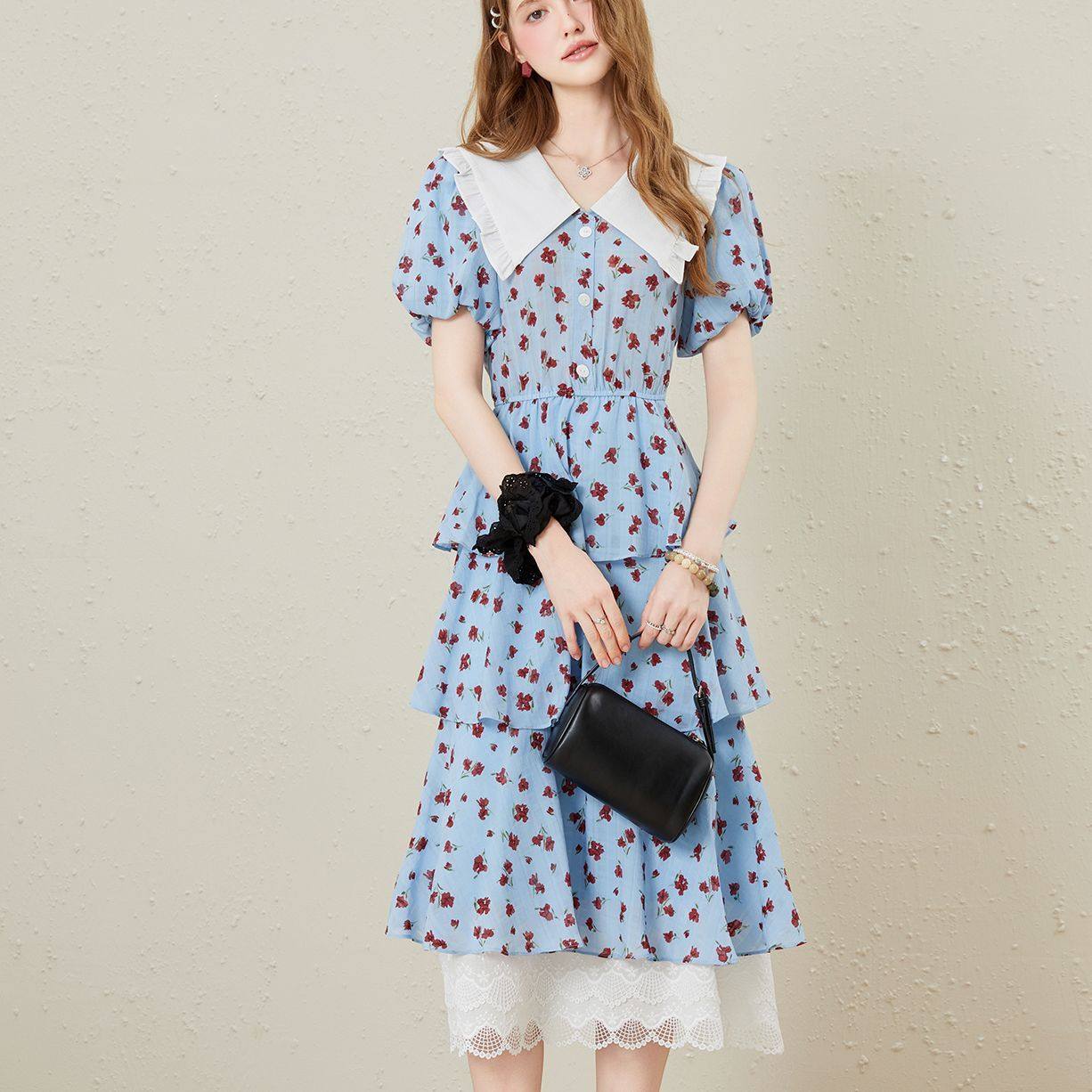 九月陌墨蕾丝拼接印花短袖连衣裙2夏季新款宽松气质中长雪纺裙女