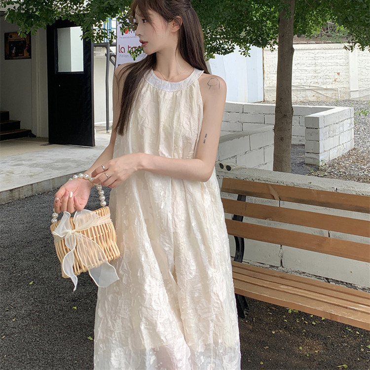 无袖挂脖连衣裙女春夏2025新款大码胖mm减龄雪纺蕾丝钩花露肩裙子