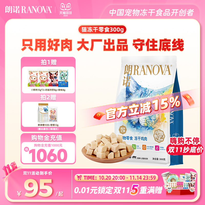 朗诺冻干猫咪零食鸡小胸鸡胸肉鸭肉干成猫宠物食品纯肉冻干300g