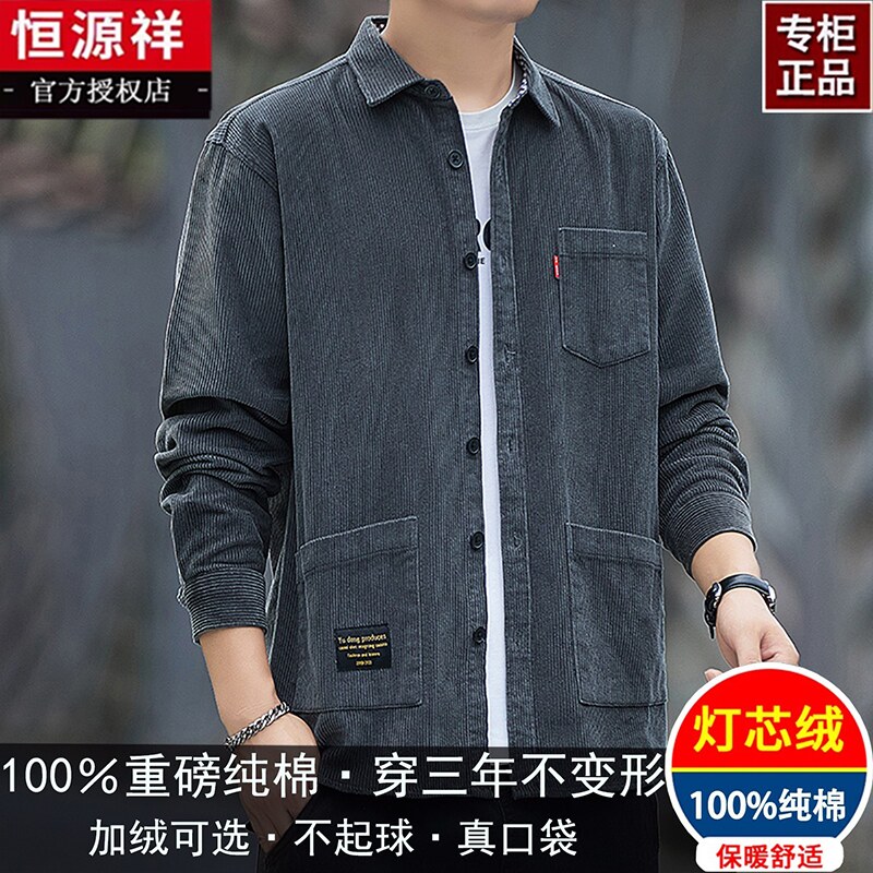 高档恒源祥100%纯棉灯芯绒衬衫男长袖秋冬加绒厚条绒休闲工装衬衣