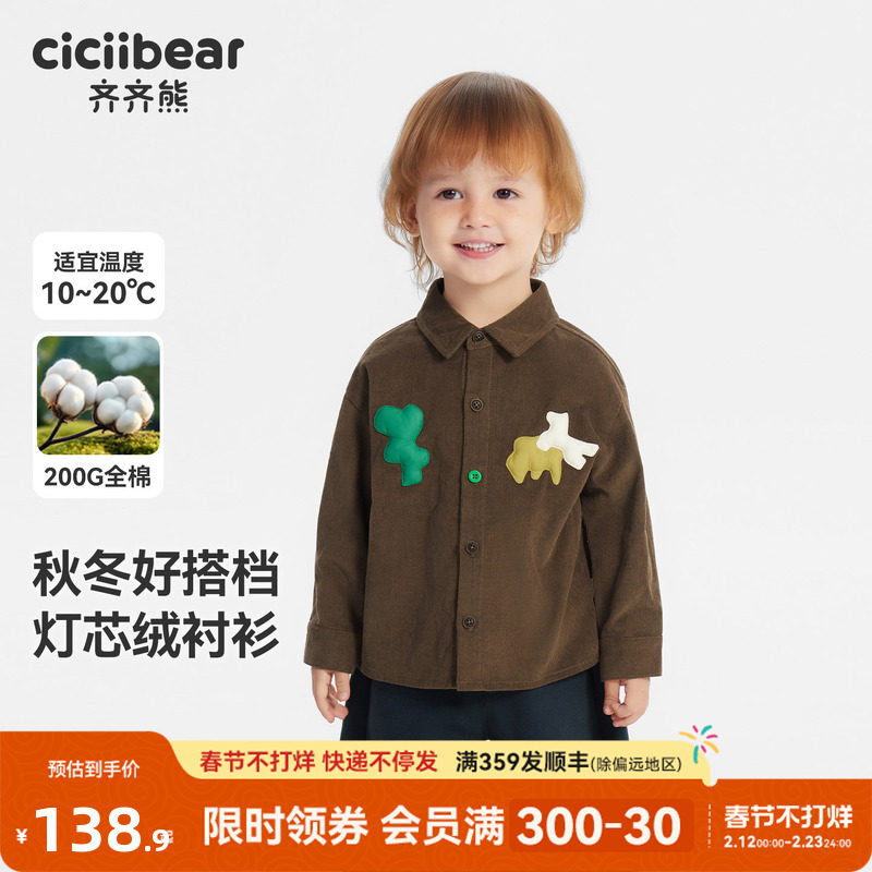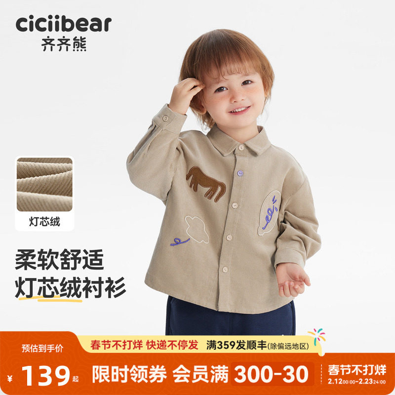 [纯棉灯芯绒]齐齐熊宝宝衬衫男童外套春秋装儿童长袖衬衣休闲上衣